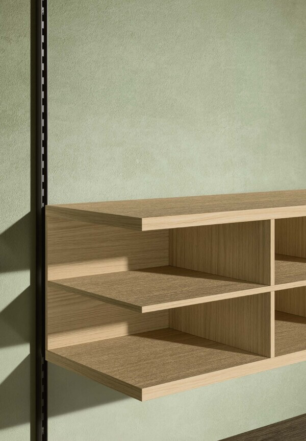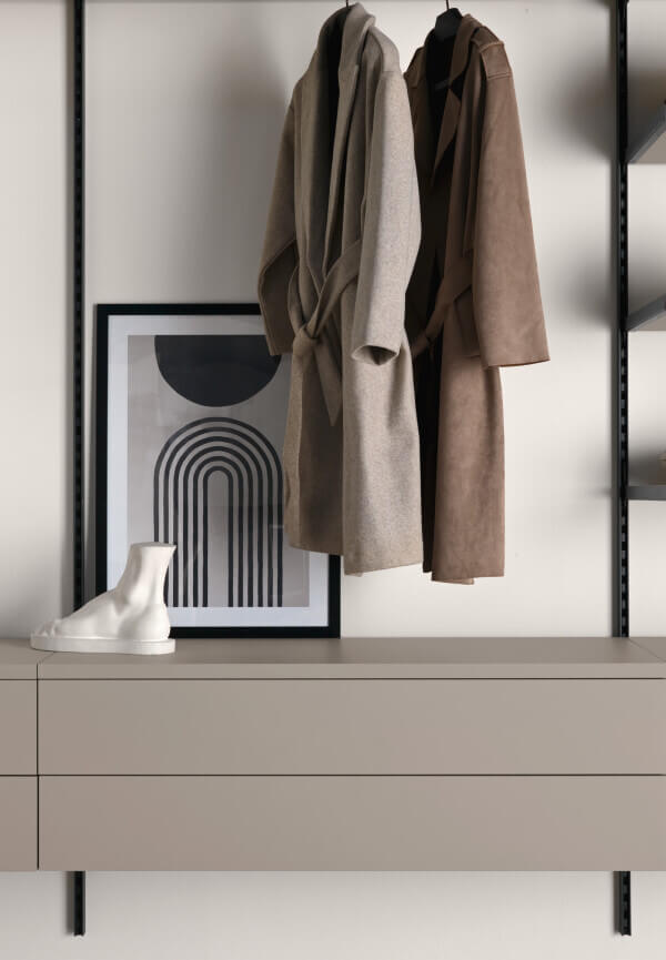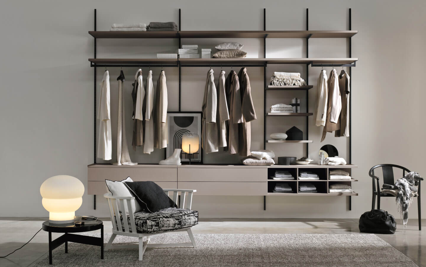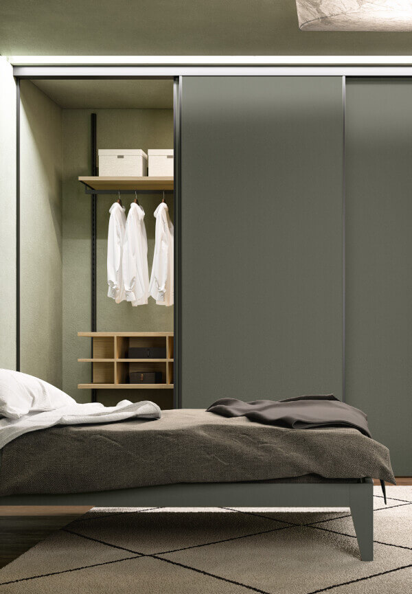 Système Flexy Easy : montants, supports d'étagères et penderie brunis, accessoires en chêne naturel. Structure de fermeture avec portes coulissantes et profil en titane brossé, portes en octane. Lit Fold: cadre de lit avec pied à 45° en octane, tête de lit en octane avec housse Klee en tissu Funny S53