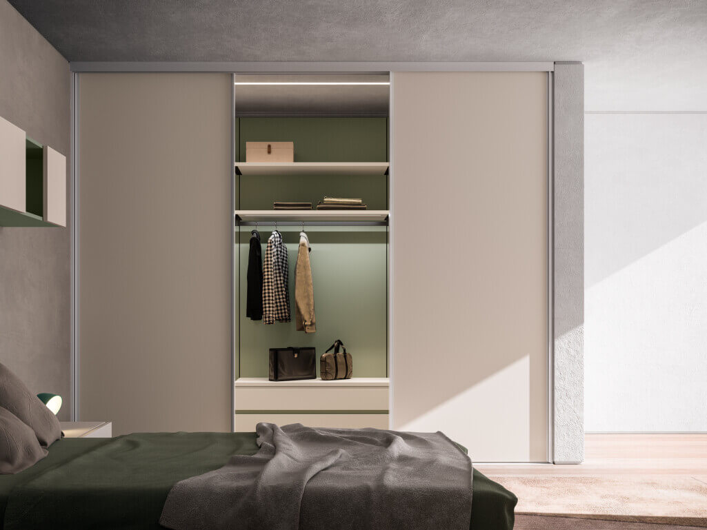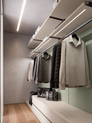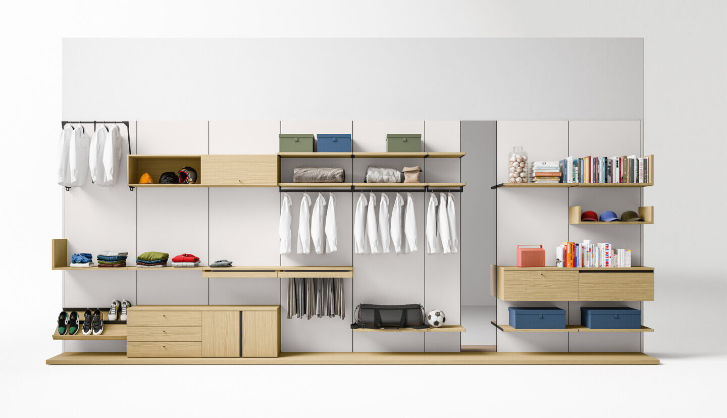 Système flexible avec panneau de briques en opus et étagères en cachemire.