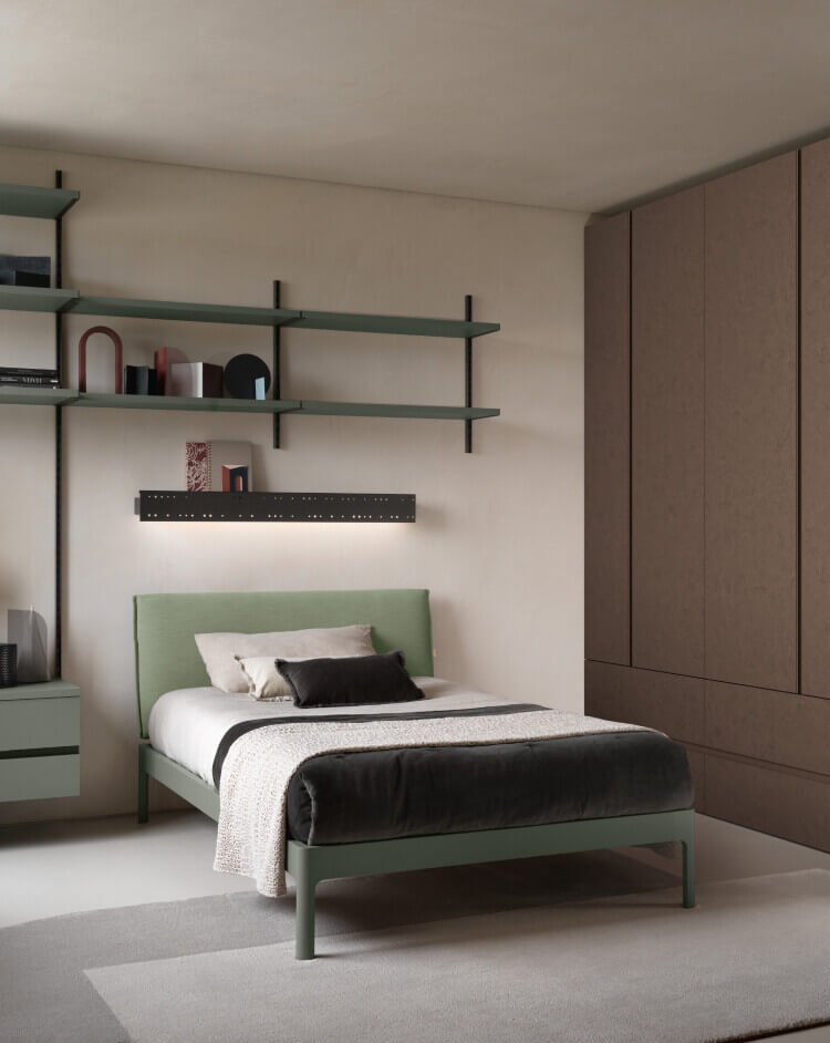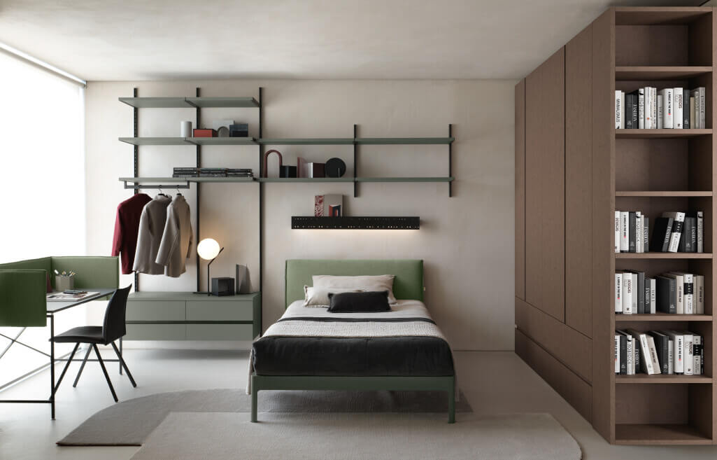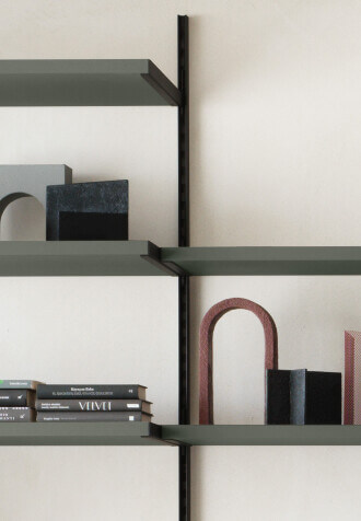 Système d'étagères Easy Flexy avec poteaux et supports d'étagères brunis, étagères en opus lime.